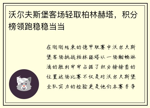 沃尔夫斯堡客场轻取柏林赫塔,积分榜领跑稳稳当当