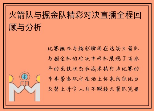 火箭队与掘金队精彩对决直播全程回顾与分析