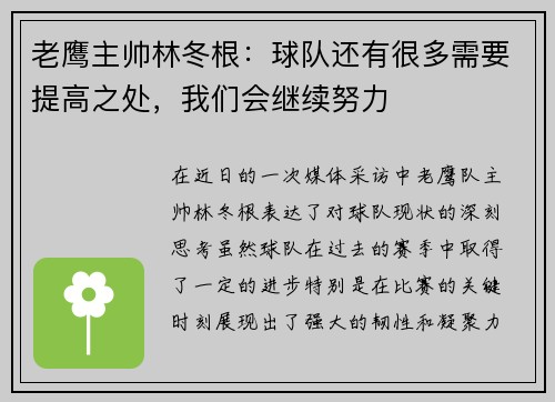 老鹰主帅林冬根:球队还有很多需要提高之处,我们会继续努力